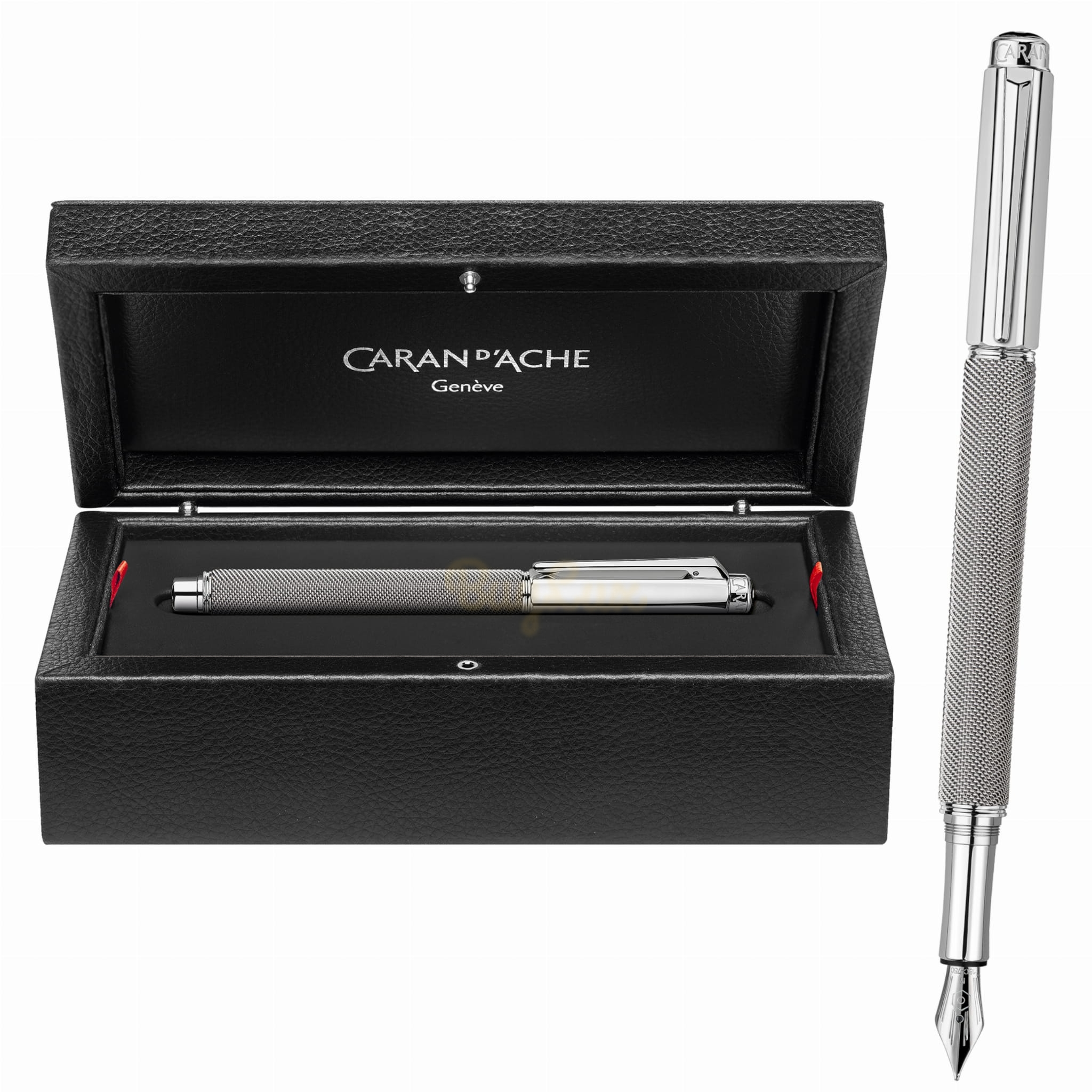 - logotyp marki Caran d’Ache i znak jakości Swiss Made wygrawerowane na pierścieniu okalającym pióro