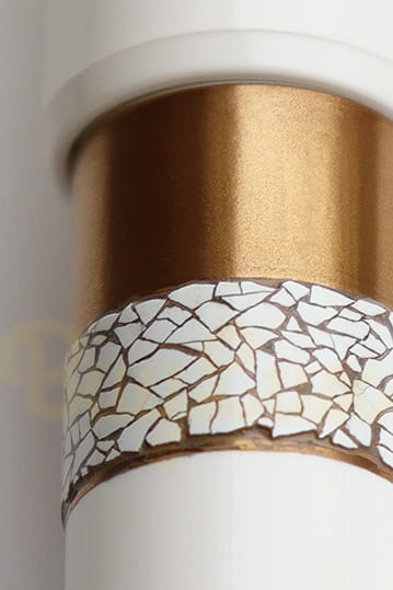Kawałki skorupki jajka ułożone w mozaikowy wzór na korpusie przywodzą na myśl okryte mgłą pola wczesnym rankiem.