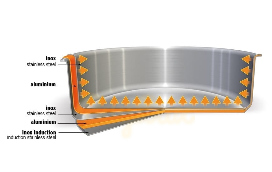 Podstawa garnków z tej serii wykonana jest z pięciu warst metalu o różnych właściwościach, które dopełniaja się nawzajem i idealnie rozprowadzaja ciepło, co powduje że gotowoanie staje się łagodne i ekonomiczne.