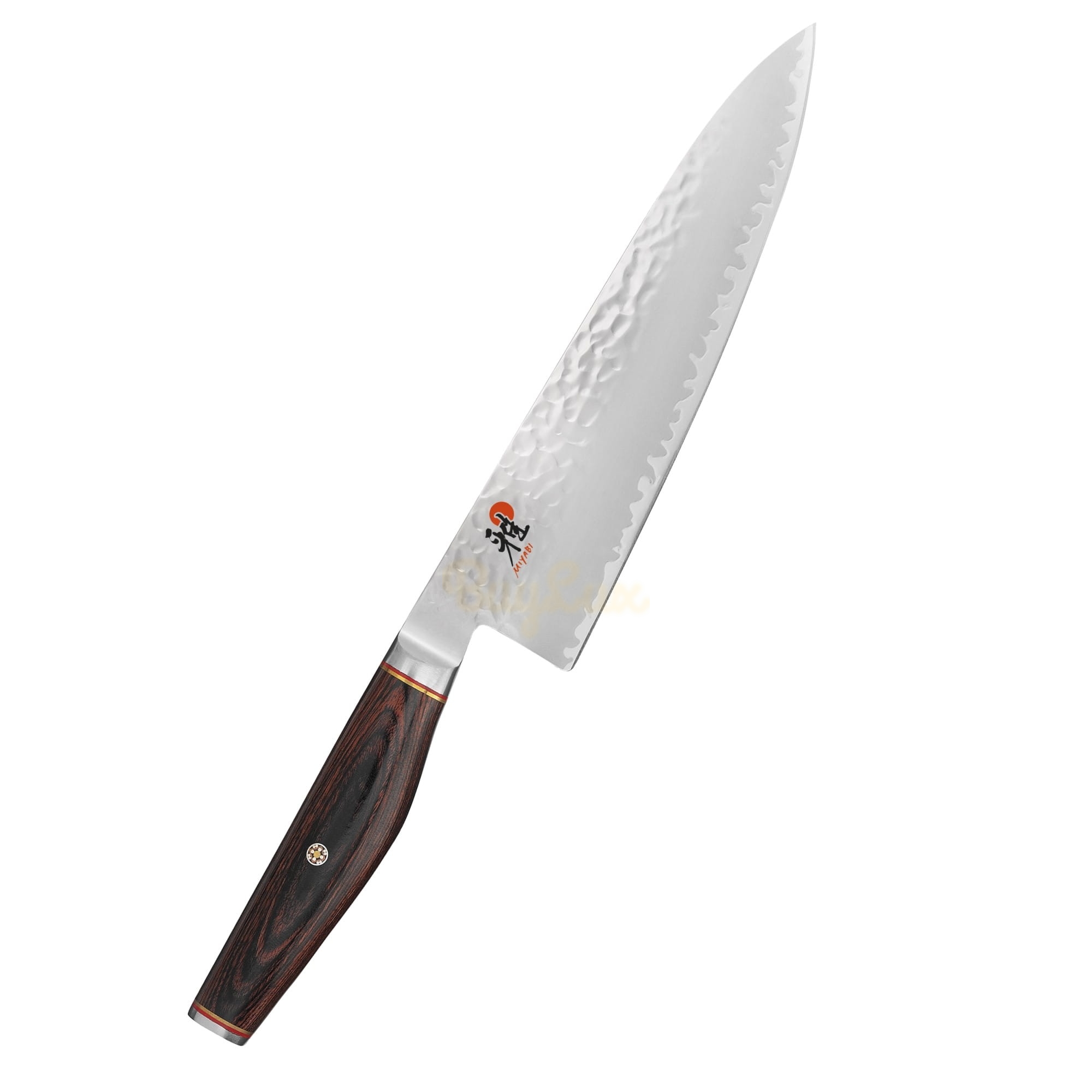 - rękojeść wyrzeźbiona z Cocobolo PakkaWood wykończona metalowym zakończeniem z logo MIYABI, czerwoną oraz wykonaną z brązu opaską