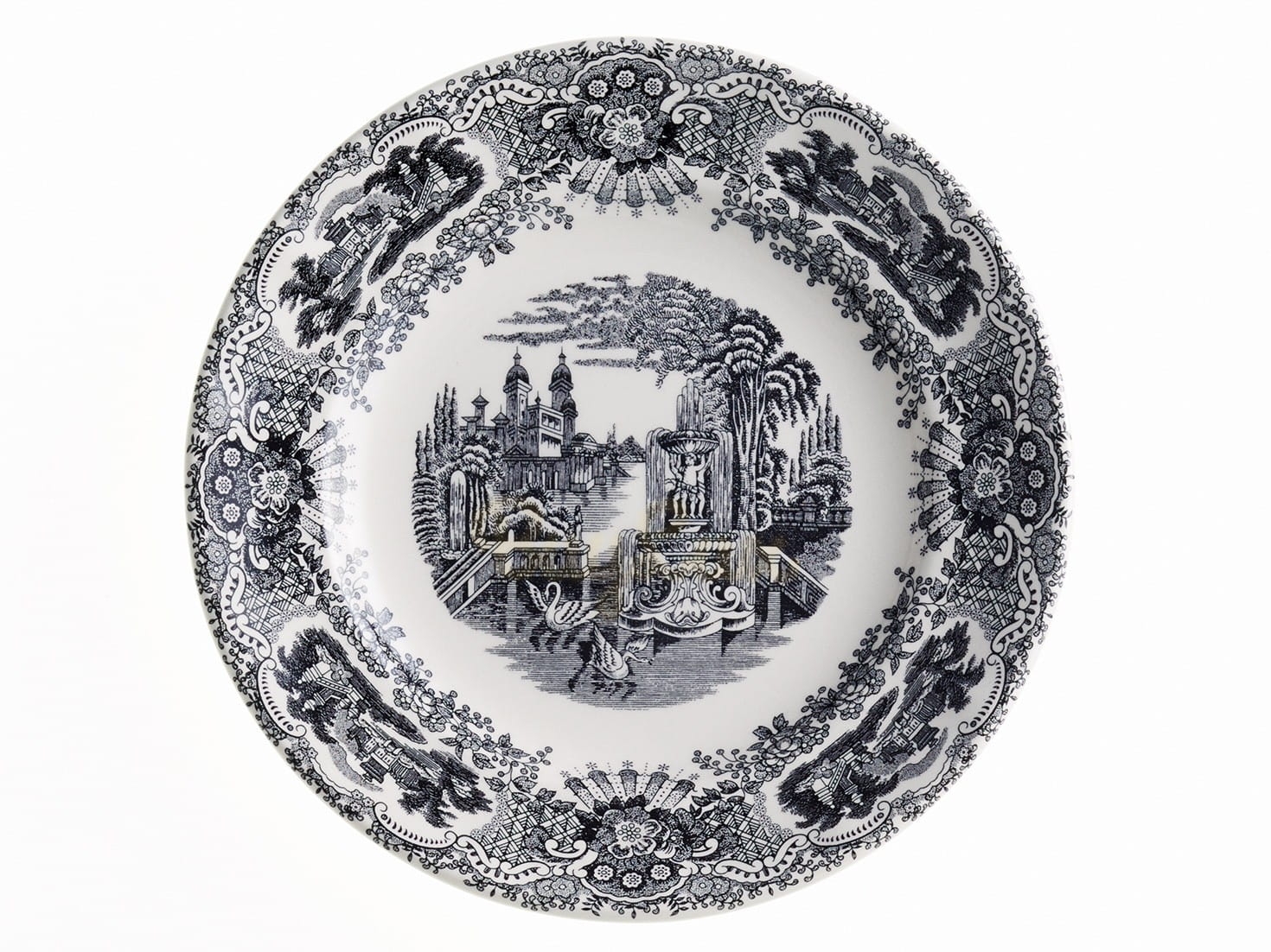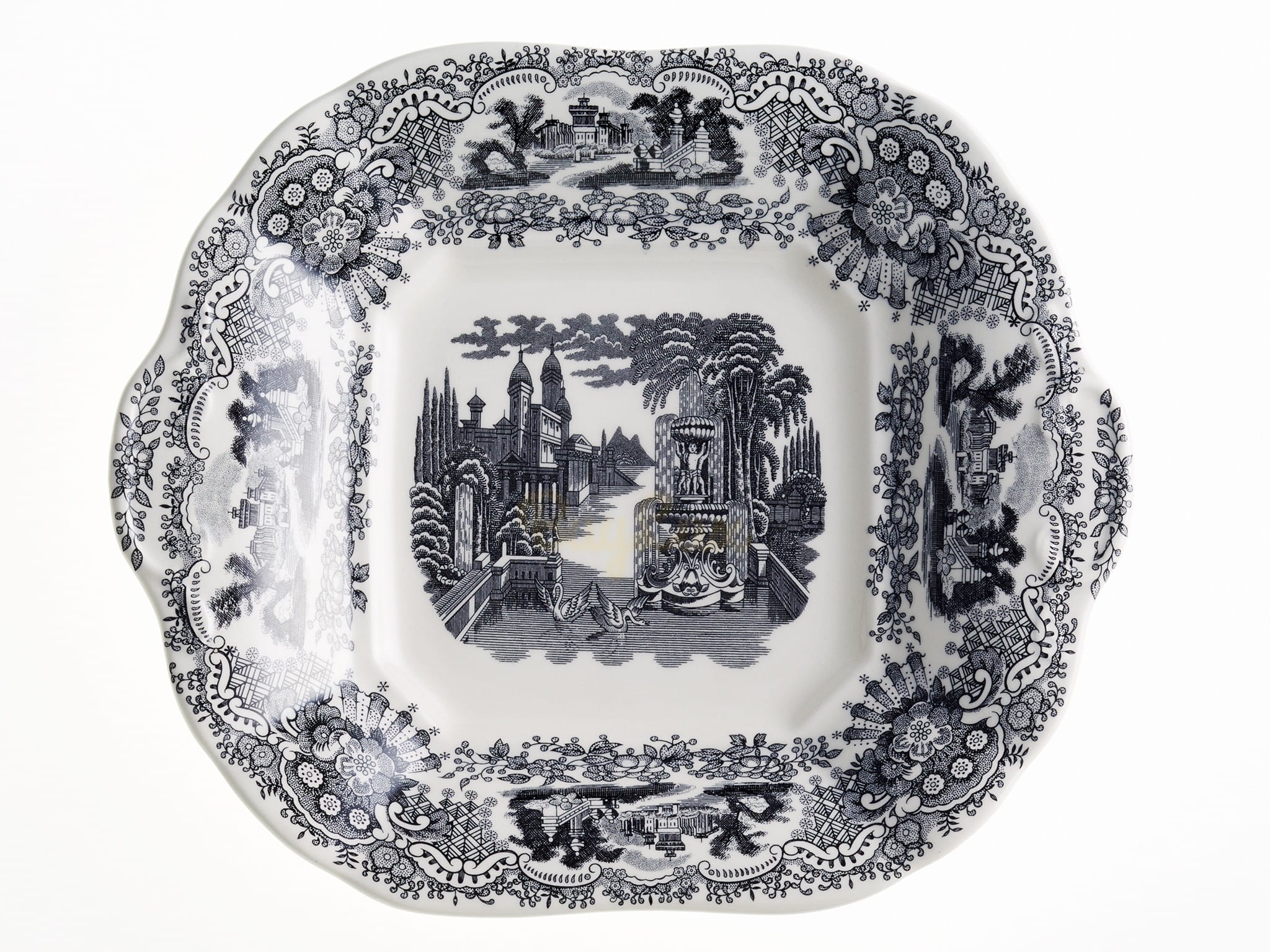 Negro Vistas to wyjątkowy wzór w kolorze czarnej dekoracji w postaci kwiatów, krat i widoków na dworki i rezydencje ziemiańskie.