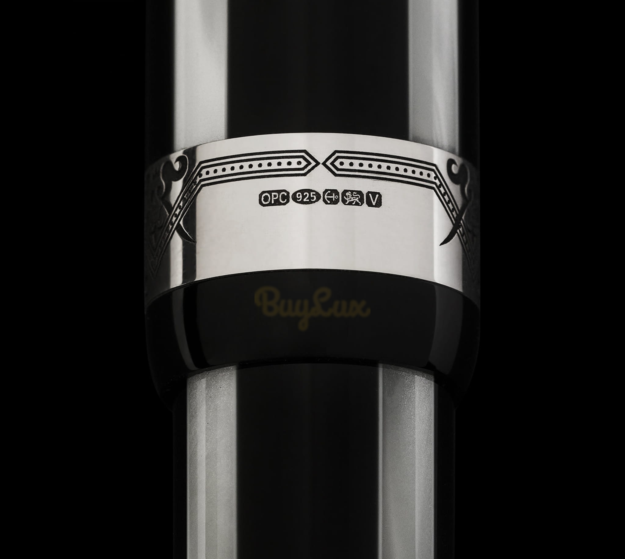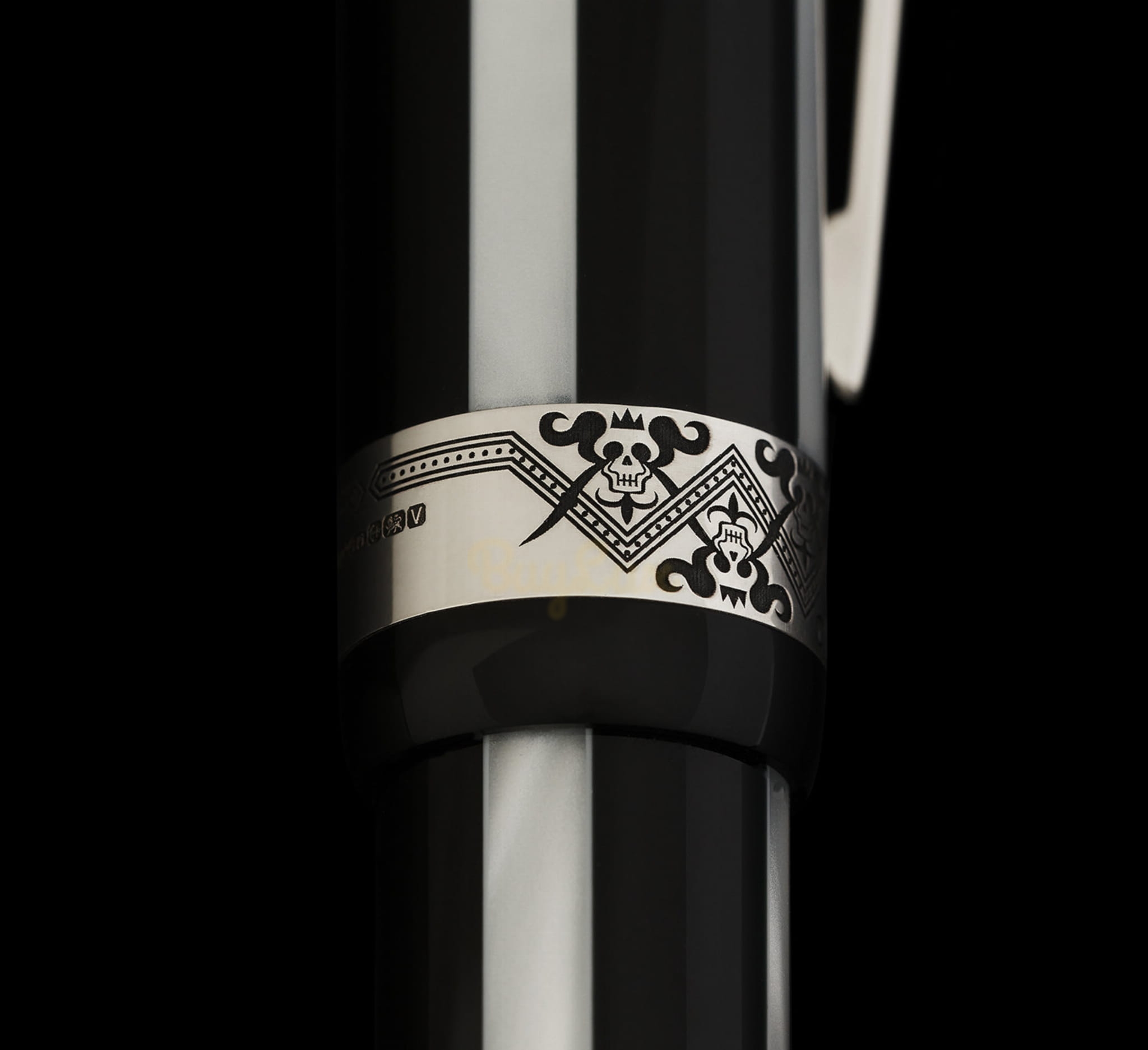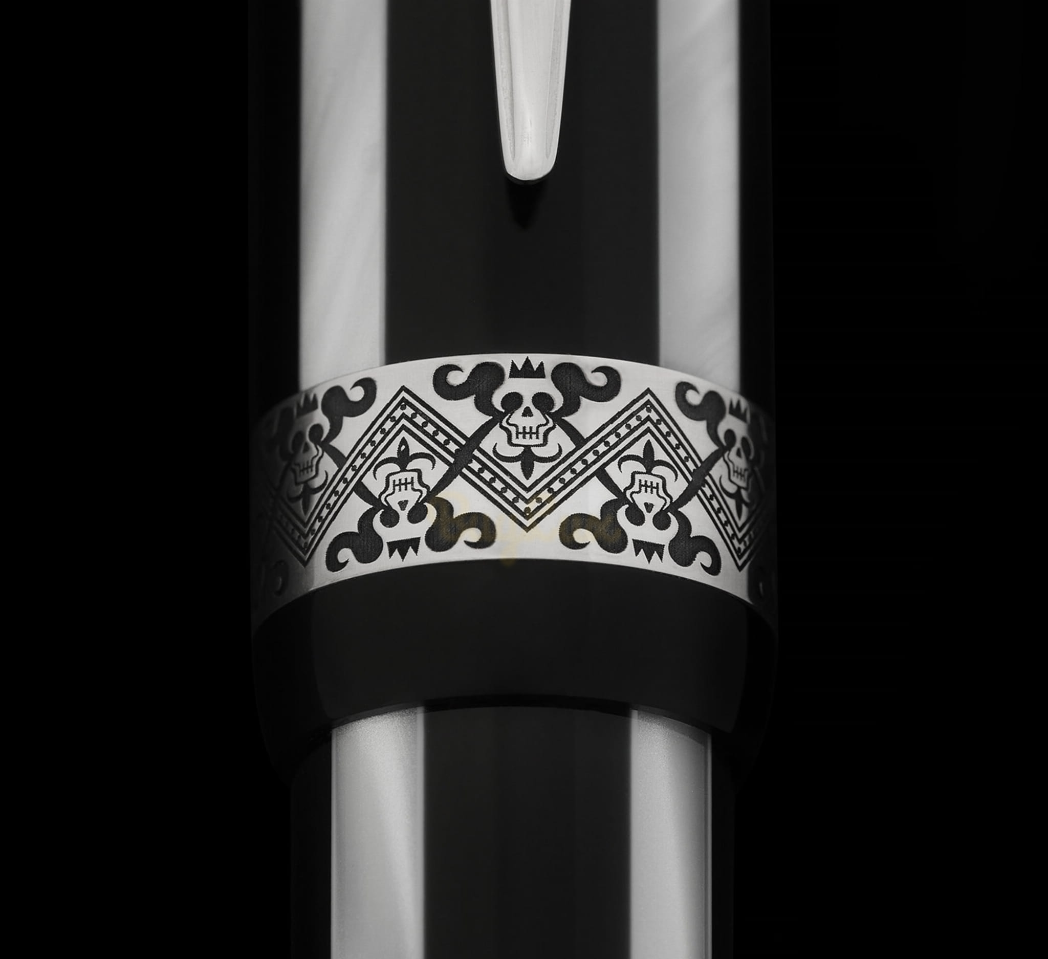 Pióro Hamlet jest wykonane z połączenia czerni i perłowej bieli, co tworzy efektowny, ale wyrafinowany wygląd, który jest wzmocniony szerokim pierścieniem z wygrawerowanym specjalnie zaprojektowanym wzorem w czaszki w koronie.